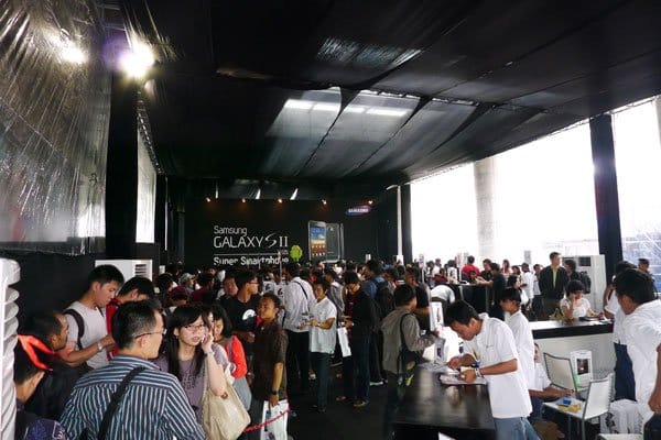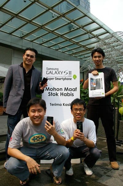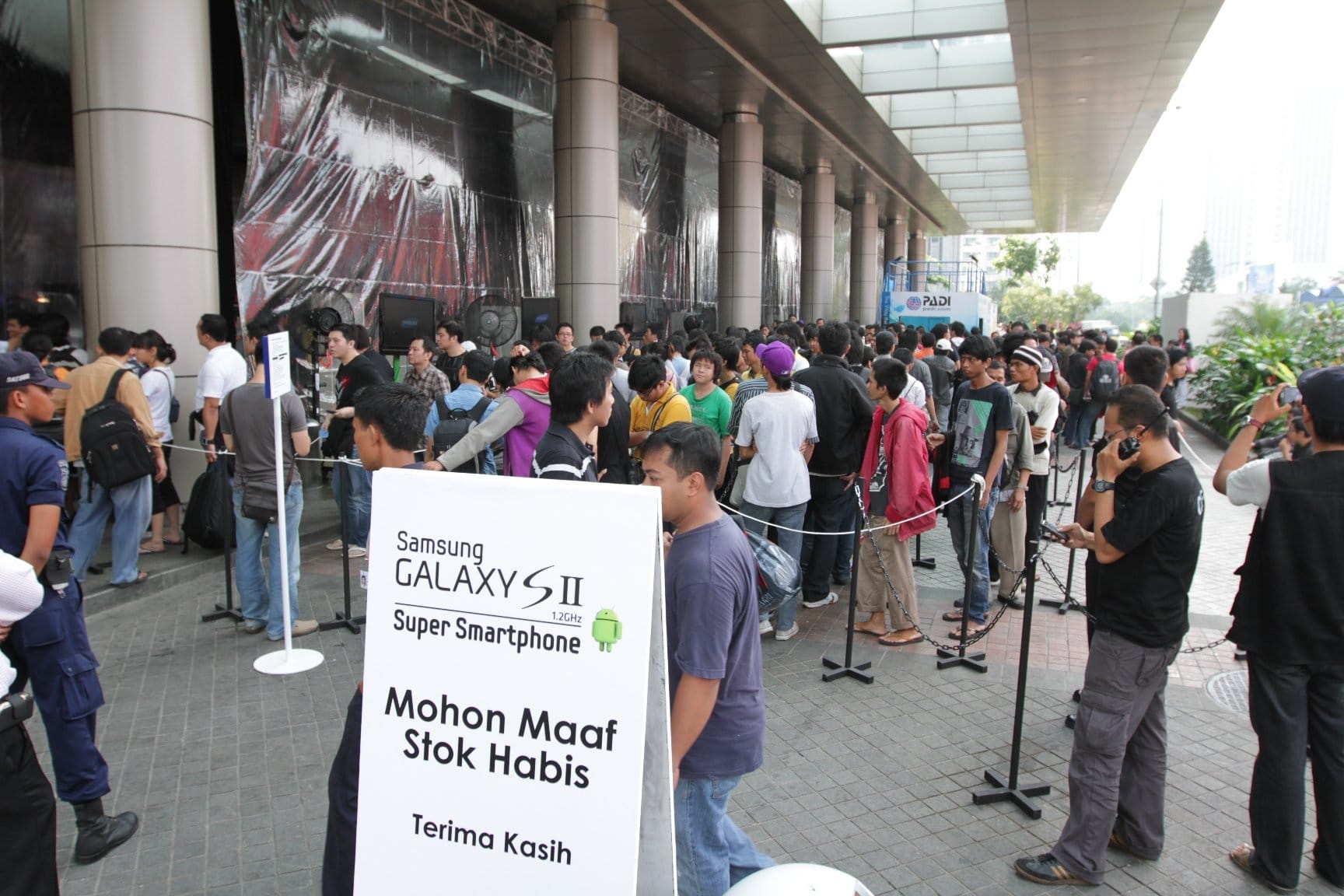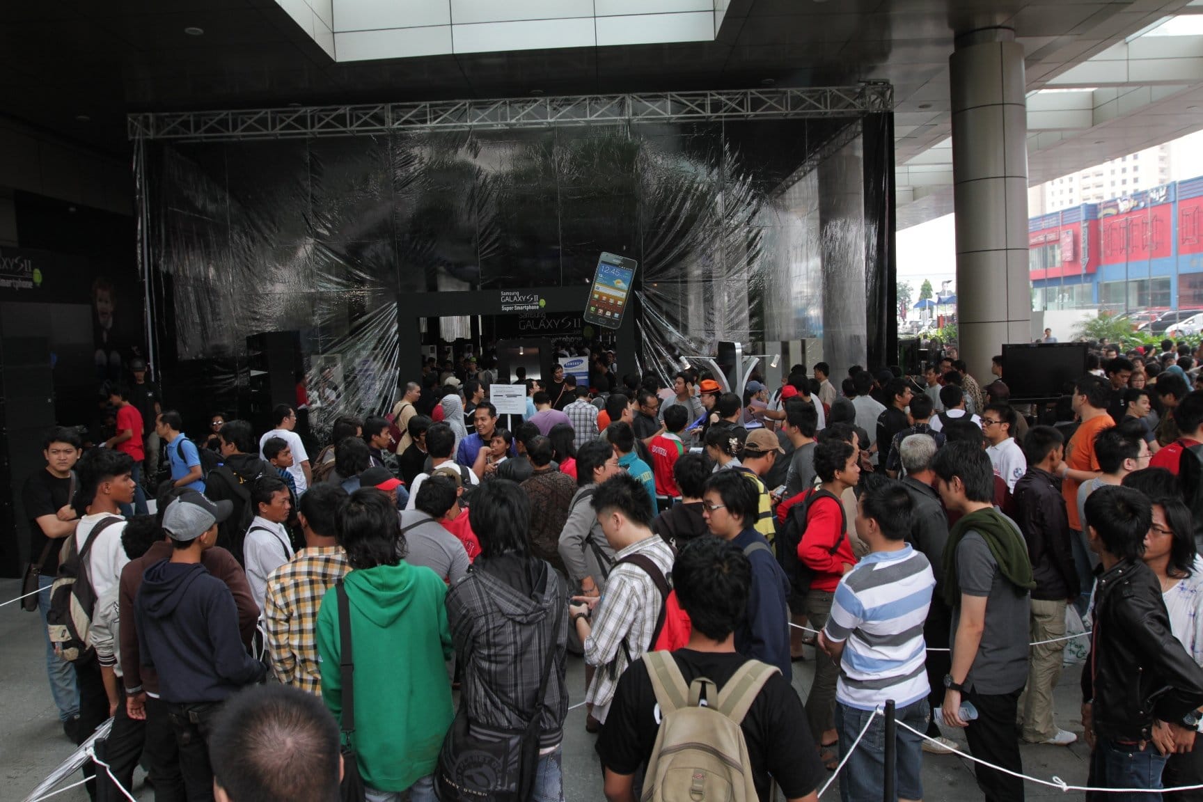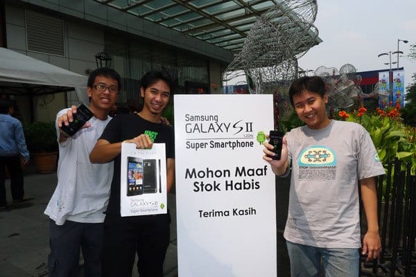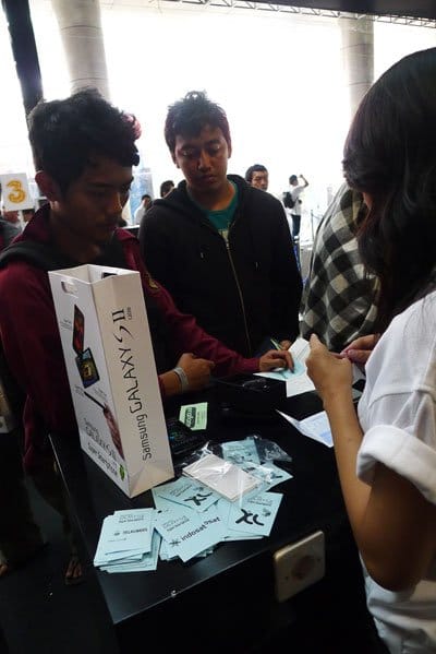 Para calon pembeli Samsung Galaxy S II kali ini bisa dibilang cukup mengejutkan, pasalnya jika pembeli pertama Samsung Galaxy Tab 10.1 waktu lalu mengantre sehari sebelumnya dari pukul 21.00 malam, kali ini pada penjualan Samsung Galaxy S II sang pembeli pertama, kedua, dan ketiga yaitu Jefry, Stanley, dan Reza rela mengantre sejak pukul dua siang di hari Jumat 22/7/2011.