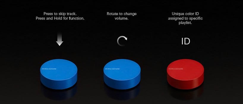 Dilihat dari desainnya yang tanpa tombol, mungkin Anda bertanya-tanya bagaimana cara mengoperasikan speaker ini. Untuk mempermudah navigasi sambil tetap mempertahankan desainnya yang minimalis, Teenage Engineering merancang sebuah remote control berteknologi Bluetooth yang diberi nama Ortho Remote.