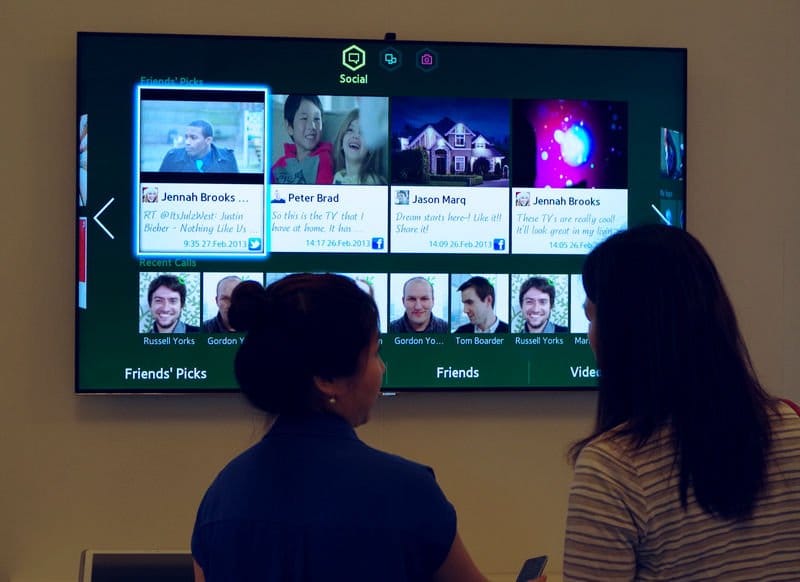 Dari belasan TV yang dipamerkan di ajang Samsung Forum 2013 ini, setidaknya ada empat TV yang menarik perhatian saya. Yang pertama adalah F8000 LED Smart TV. Desain tipis dan stand melengkungnya memberikan kesan mengambang. Samsung F8000 juga merupakan TV pintar pertama Samsung yang dilengkapi prosesor quad-core yang memperlancar kemampuannya menjalankan aplikasi, browsing, dan memutar video. Bicara soal Smart TV, Samsung sudah memperbaharui tampilan Smart Hub menjadi lebih dinamis dan lebih sederhana saat digunakan. Kini ada tiga panel utama, yaitu Apps, kemudian ada Photos, Video & Music, dan Social. Di panel Apps, Anda dapat melihat 30 ikon aplikasi yang dapat dikostumisasi. Menavigasi Smart Hub juga bisa dilakukan dengan fungsi Voice Control yang kini sudah mengenali 300 perintah (versi 2012 hanya 50 perintah).