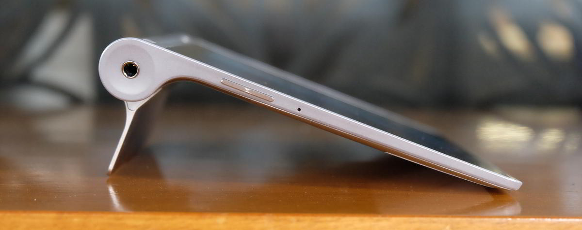 Dari pengalaman kami, adanya pilihan mode penggunaan ini amat berguna dan cukup optimal untuk berbagai skenario penggunaan. Selot kartu SIM (bisa digunakan untuk menelpon pada versi 8 inci) dan kartu memori dengan pintar diposisikan di bagian belakang, tersembunyi dengan rapi saat penyangga dalam kondisi tertutup. Dengan begitu, tidak ada tutup karet atau rongga lain yang ada di bagian samping Yoga Tablet kecuali konektor micro USB.