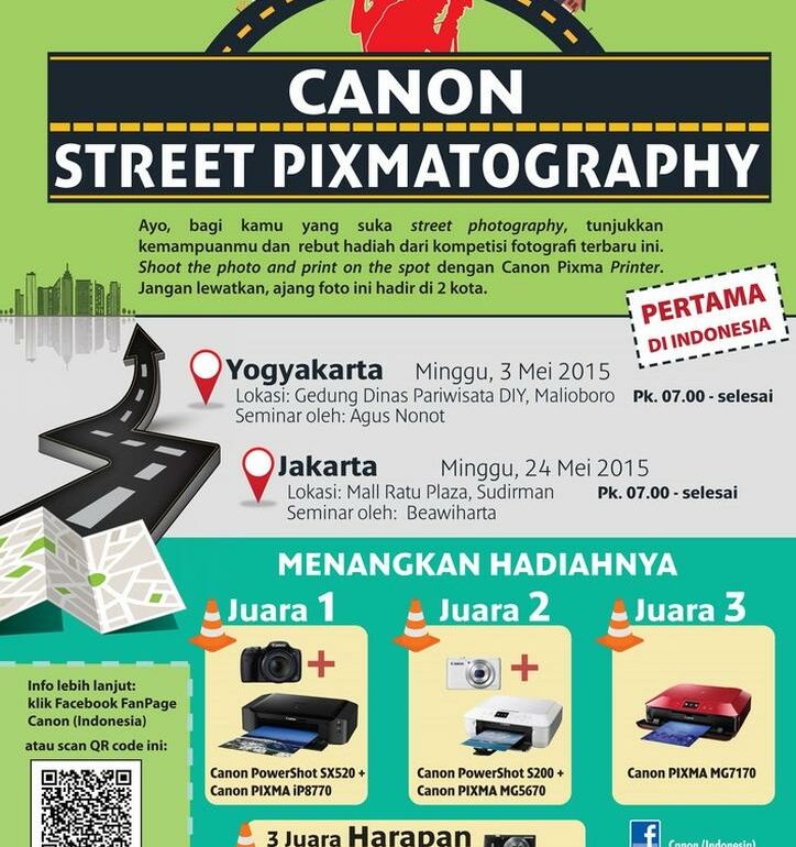 Untuk Anda yang ingin mengasah kemampuan fotografi khususnya di aliran street photography, Canon PIXMA Printer mempersembahkan ajang lomba foto Canon Street Pixmatography.