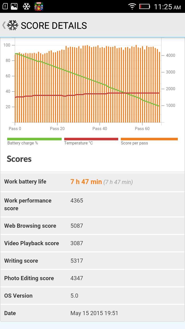 Daya tahan baterai juga cukup baik, dengan mencatatkan waktu di atas 7 jam di PCMark. Pada saat diuji untuk pola penggunaan browsing Internet, memotret, memasang aplikasi, memainkan game, serta mengakses jejaring sosial, Lenovo A7000 mampu bertahan sekitar 11 jam sebelum harus dihubungkan ke outlet listrik. Ini merupakan raihan yang baik mengingat layarnya yang besar tersebut cukup menyedot daya.