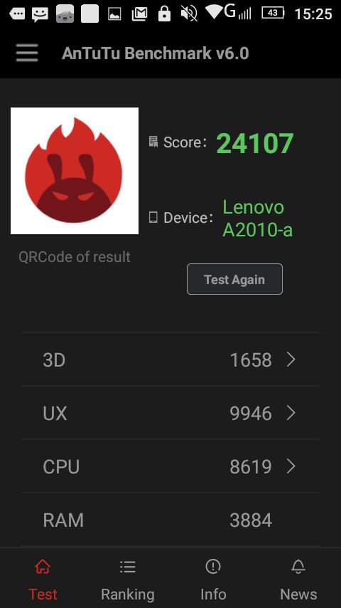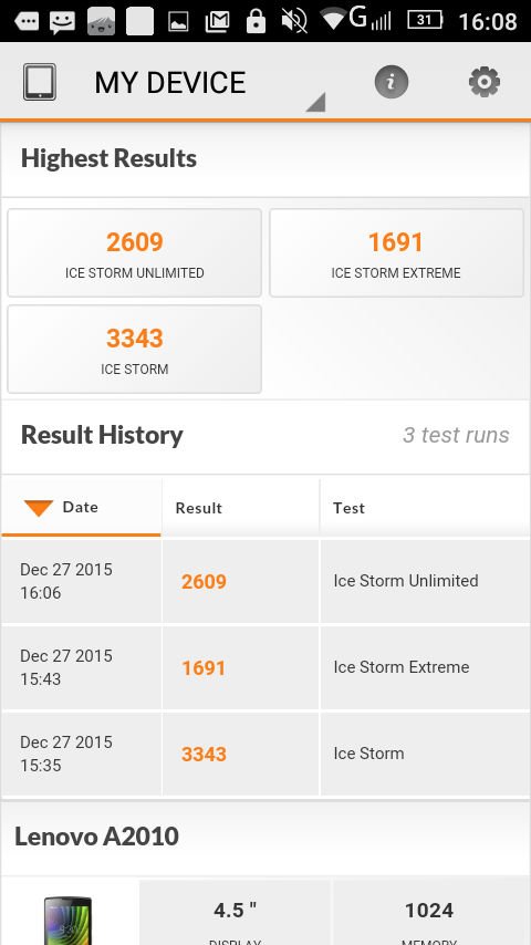 Meskipun nilai sintetis Lenovo A2010 cenderung minimal, pada kenyataannya, Lenovo menyertai smartphone ini dengan optimalisasi yang menyeluruh. Dengan resolusi layar 854 x 480 Pixel, tidak terlalu banyak pixel yang harus diolah oleh GPU Mali T720. Saat kami mencoba memainkan game-game terkini seperti Horizon Chase, Hungry Shark dan Dead Trigger 2, ponsel ini mampu menjalankannya dengan baik. Memang kapasitas RAM 1 GB untuk Android masa kini terasa kurang besar. Namun sekali lagi, Lenovo mengoptimalkan Android 5.1 yang hadir pada A2010 dengan baik.