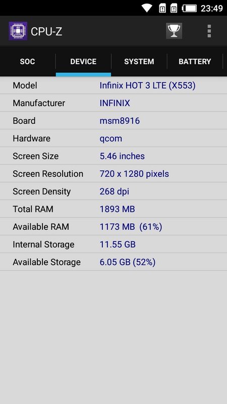 Infinix Hot 3 dipersenjatai SoC Qualcomm Snapdragon 415 dengan prosesor octa-core dan GPU Adreno 405 (pada CPU-Z masih terbaca Snapdragon 615). Ditemani RAM 2 GB, perpaduan tersebut sudah cukup untuk mendukung berbagai kebutuhan. Untuk ruang penyimpanan data, Hot 3 memiliki memori internal 16 GB plus slot microSD.