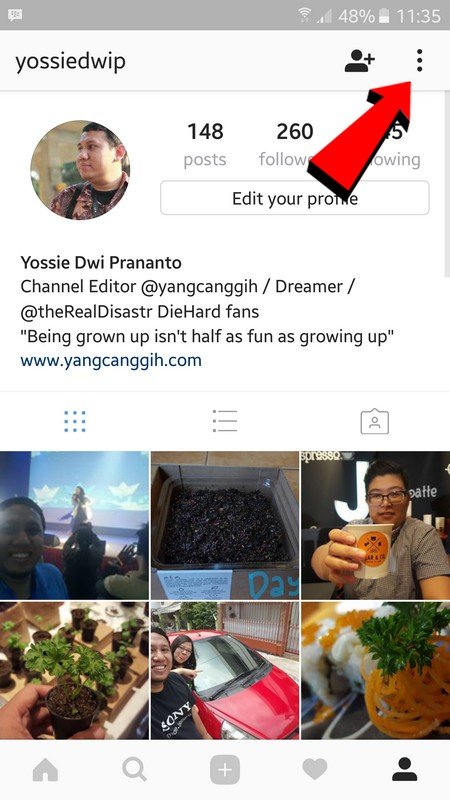 1. Masuk ke halaman akun Instagram Anda dan tekan ikon tiga titik vertikal di pojok kanan atas.