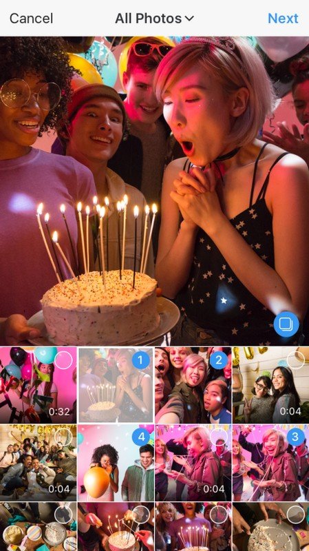 4. Anda bisa memilih hingga 10 foto atau video untuk di-upload. Di setiap foto akan muncul nomor yang menunjukkan urutan foto tersebut muncul di posting-an Anda. Urutan tersebut bisa di-edit nanti
