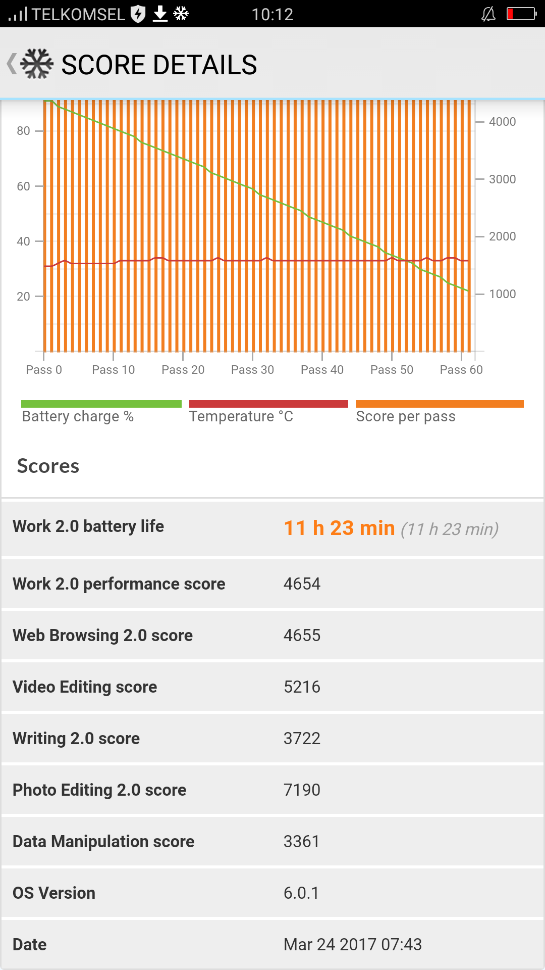 Selain performa yang cukup kencang, Oppo F3 Plus juga memiliki performa baterai yang amat baik. Hasil tes menggunakan PCMark Work 2.0 menunjukkan baterai 4000mAh Oppo F3 Plus mampu bertahan hingga hampir 12 jam.