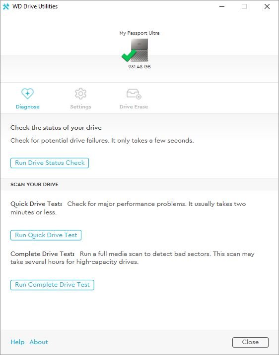 - WD Drive Utilities: Berfungsi untuk membantu Anda dalam memantau kondisi hard disk eksternal ini. Aplikasi ini bisa menunjukkan kapasitas yang tersisa dan estimasi umur pakai perangkat ini. Terdapat juga fungsi untuk melakukan format dan secure erase untuk menghapus isi hard disk ini dengan aman agar filenya tidak bisa direcover.