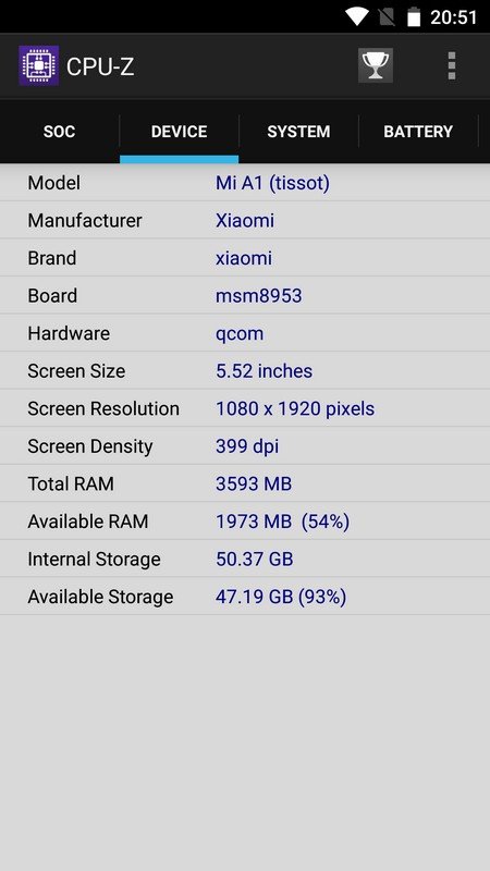 Xiaomi Mi A1 dipersenjatai SoC Qualcomm Snapdragon 625 (14nm) dengan prosesor Octa-core Cortex-A53 berkecepatan 2.0 GHz, dan GPU Adreno 506. RAM yang dibenamkan besar, yakni 4 GB, dan memori internalnya pun lega, 64 GB, lengkap dengan slot microSD hybrid (menggunakan slot SIM-card 2). Sedikit membahas soal ketersediaan sensor, Mi A1 termasuk komplit (lihat gambar CPU-Z paling kanan). Tapi sayangnya, belum ada NFC. Padahal, NFC diprediksi akan semakin dibutuhkan oleh pengguna di Indonesia. Misalnya untuk mengecek saldo e-Money.