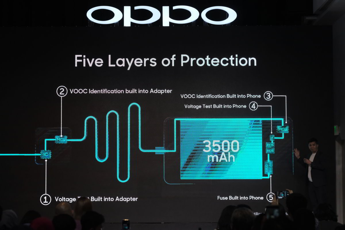 VOOC Flash Charge adalah teknologi yang tidak hanya menawarkan kecepatan tinggi, tetapi juga keamanan ekstra. Oppo memberikan perlindungan lima lapis mulai dari penguji tegangan di dalam adapter, pengenal VOOC di dalam adapter, pengenal VOOC di dalam ponsel, uji tegangan di dalam ponsel, hingga sekering di dalam ponsel.