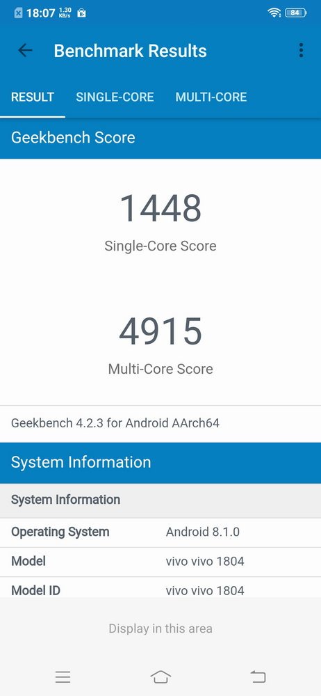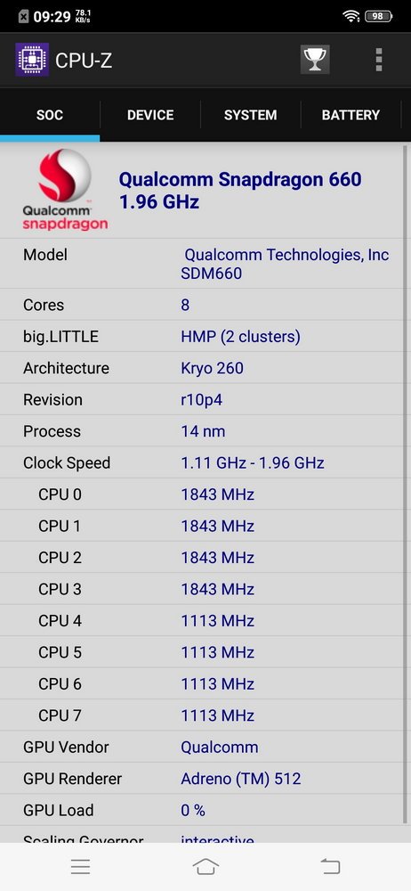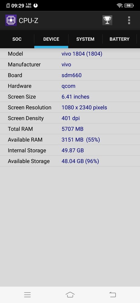 Vivo V11 Pro memiliki performa yang kencang berkat perpaduan chipset Qualcomm Snapdragon 660 dengan RAM 6GB dan memori internal 64GB. Kombinasi yang sudah memadai untuk berbagai keperluan mulai dari menjalankan game terkini hingga menyunting foto dan video, meski jika dilihat dari data yang ditampilkan oleh CPU-Z, clock speed dari CPU-nya sedikit diturunkan.