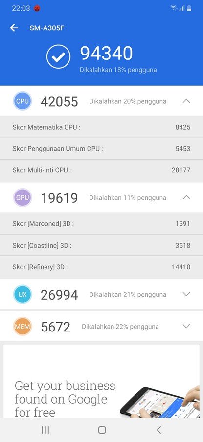 Masih penasaran dengan performa Galaxy A30, simak hasil pengujian kami menggunakan aplikasi benchmark di bawah ini: