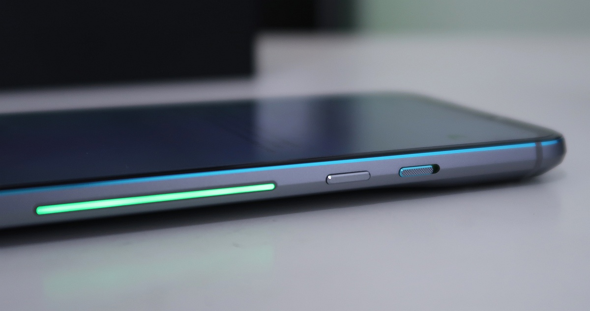 Jika dilihat dari depan, tidak ada yang spesial dari Black Shark 2 Pro. Awalnya kami kurang suka dengan bezel bagian atas dan bawahnya yang cukup tebal untuk ukuran smartphone masa kini. Oh, pasti karena di kedua sisi tersebut Black Shark menaruh speaker stereo yang menghadap ke depan; begitu yang ada di pikiran kami. Tapi seiring waktu, kami merasa bezel seperti inilah yang paling ideal untuk bermain game. Kami pernah bermain di smartphone yang punya bezel atas dan bawah super tipis, tapi justru sering tidak sengaja menekan layar.