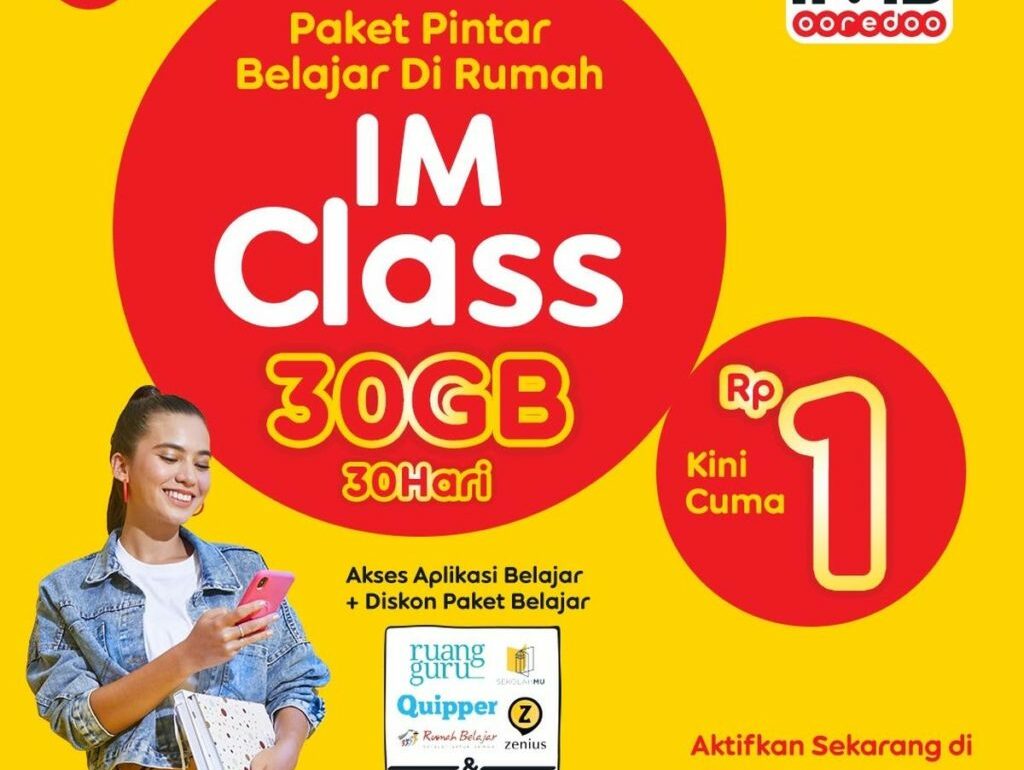 Tapi, tidak hanya itu saja IM3 Ooredoo juga meluncurkaan paket pintar IMClass. Paket ini menawarkan kuota 30GB dengan harga hanya Rp1. Paket IMClass bisa digunakan untuk mengakses platform belajar online terpopuler dan portal edukasi universitas-universitas di Indonesia. Paket IMClass juga dapat dinikmati kapan saja, dimana saja dengan masa aktif 30 hari dan pelanggan bisa dengan mudah mendapatkannya melalui aplikasi myIM3.