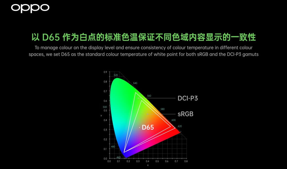 OPPO menyebut kalibrasi layar perangkat mereka memungkinkan akurasi warna yang setara dengan film digital profesional dengan nilai JNCD sekitar 0,4. Di sisi lain, algoritma milik OPPO menjamin kompatibilitas gamut warna dengan menyesuaikan DCI-P3 dan titik putih D65 pada tengah ruang warna.
