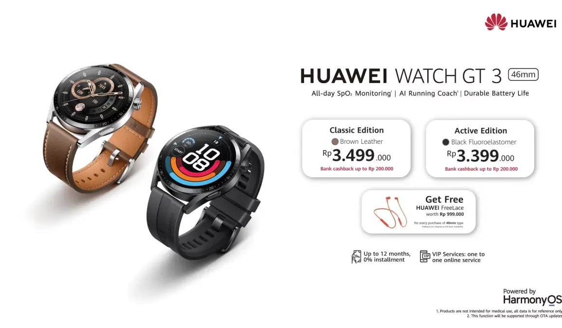 Huawei Watch GT 3 sudah bisa di pre-order mulai 8 November hingga 26 November 2021 secara offline dan online. Harga Huawei Watch GT 3 46 mm Classic Edition dengan strap kulit berwarna cokelat Rp3.499.000. Untuk Active Edition dengan strap fluoroelastomer warna hitam seharga Rp3.399.000.