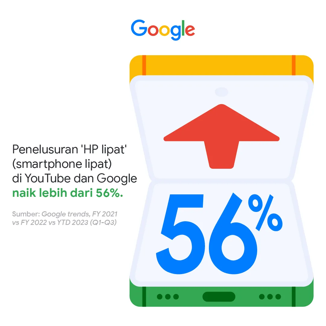 Melihat tren yang meningkat tersebut, tahun ini Google melakukan survei konsumen yang menemukan bahwa 3 dari 5 (62%) responden menginginkan smartphone lipat saat mereka nanti membeli smartphone baru. Survei dilakukan terhadap 1.514 responden berusia 18 – 55 tahun di berbagai provinsi di Indonesia.