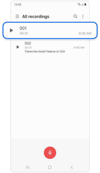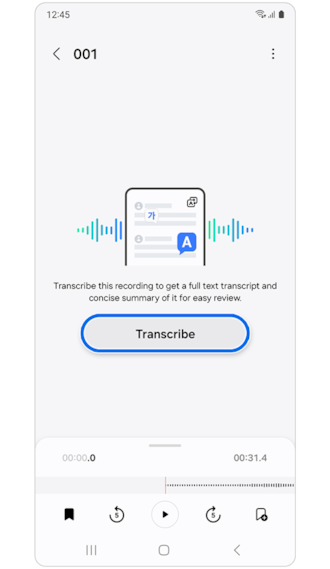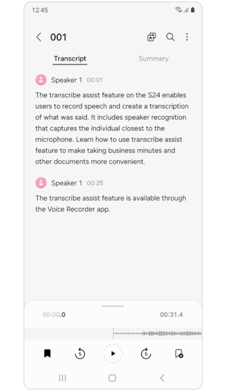 4. Transkripsi akan ditampilkan pada layar Galaxy S24 Anda. Sebagai catatan, untuk transkrip yang akurat, pembicara harus berbicara dengan jelas dan dekat dengan mikrofon.