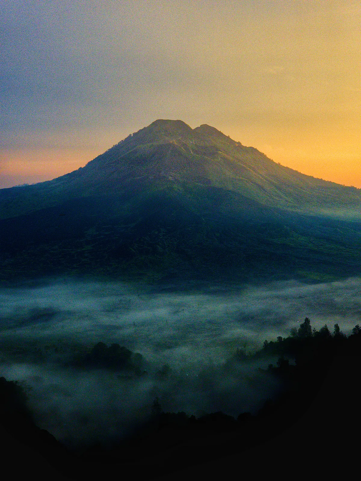 Sekitar pukul lima dini hari, kami telah tiba di Montana Del Cafe, sebuah kafe di Kintamani yang letaknya persis di depan gunung Batur. Dalam hitungan menit, cahaya mentari pagi menyeruak dari sisi kanan gunung Batur, memamerkan bias-bias warna yang membuat kami terpana sesaat.